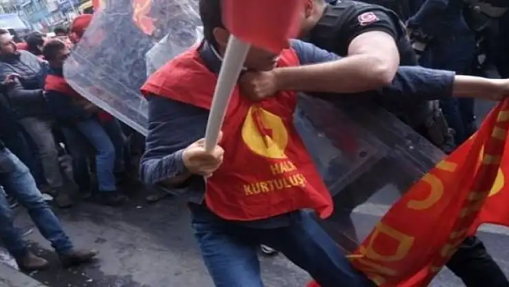 Taksim’e yürümek isteyen Halkın Kurtuluş Partisi üyesi gruba polis izin vermedi. Grup yürümekte ısrar edince polis müdahalede bulundu. Gruptakiler gözaltına alındı.