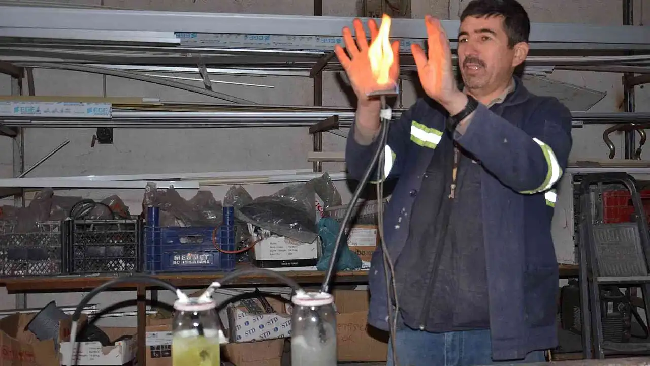 Elbistan'da sanayi sitesinde PVC alüminyum doğrama işi yapan 45 yaşındaki Selçuk Koyuncu, elektrik ve kömüre gelen zamlar nedeniyle işyerini ısıtmakta zorlanınca, ilk başta tehlikeli ve pahalı gibi görülse de farklı bir yönteme başvurdu. Koyuncu, benzin ve su kullanarak gaz üretmeye dayanan sistem için 2 adet kavanoz aldı. Kavanozun birine benzin diğerine de su dolduran Koyuncu, iki kavanoz arasında da hortumla bağlantıyı sağladı. Benzinin olduğu kavanoza, kompresörle hava veren Koyuncu, çıkan gazı da su dolu kavanoza aktardı. Su ile birleşen gazın çıkışına da tip başlığı takan Koyuncu, sistemi yaklaşık 15 liraya mal etmiş oldu.