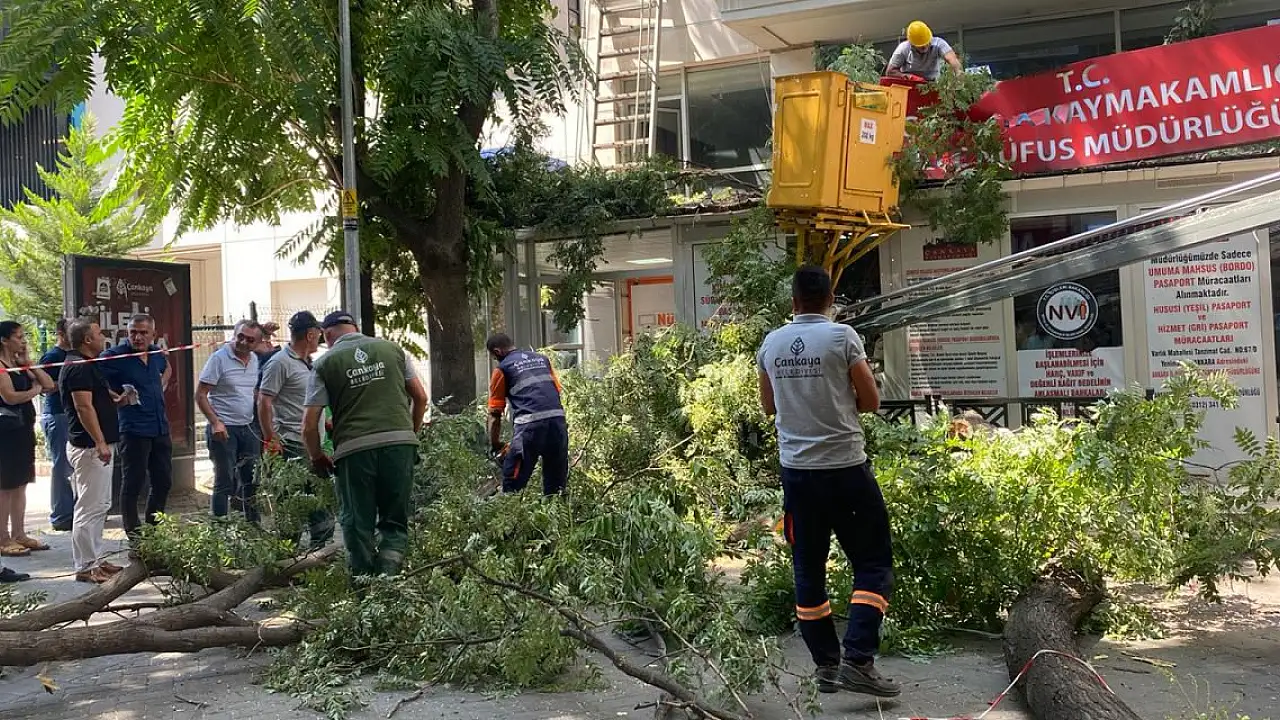 Olay, öğle saatlerinde Çankaya'daki Bayındır 1 Sokak'ta meydana geldi. Yol kenarındaki akasyanın yaklaşık 10 metrelik dalı, İlçe Nüfus Müdürlüğü'nün üzerine devrildi. Bu sırada yoldan geçenler de panik yaşadı. Ağaç dalının devrilme anı ise iş merkezinin güvenlik kamerasına yansıdı. İhbarla bölgeye gelen belediye ekipleri, ağaç dalını kaldırdı. Yaralanan olmazken, nüfus müdürlüğünün tabelası hasar gördü.Bölge esnafından Levent Sümbül, "Bir çatlama sesi duyarak dışarı çıktım. Ağaç yaşlı bir ağaç olduğu için kırılmış, nüfus müdürlüğünün üstüne düşmüş. İnsanlar vardı sokakta. Nüfus müdürlüğünün üzerine düştüğü için yaralanan olmadı. Belediye zaten ağacı kaldırdı. Burası yoğun bir sokak ama sıkıntı yok çok şükür" dedi.