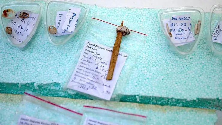 "Bu yılki kazılarla milattan önce 11 bin 500'lü yıllara kadar tarihlenen döneme rastladık. Bunlardan biri ve en önemlisi, bugün Kahramanmaraş'ta tekstil ve konfeksiyona yönelik oldukça yoğun bir ekonomik yapı var. Bu yapının temellerini bölgedeki bu tür arkeolojik yerleşim yerlerinde de görmek mümkün. Direkli Mağarası bunlardan bir tanesi. Mağarada hayvan kemiklerinden yapılmış delikli iğne yani bugün dikiş iğnesi dediğimiz bir iğnenin ve bunun benzeri kırık parçaların bulunduğu ve bir de kemikten yapılmış başlı iğne (toplu iğne) bulundu. Bunlar konfeksiyonun olmazsa olmazı olan aletler.