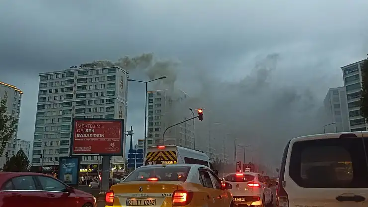DİYARBAKIR'da 13 katlı bir binanın çatı katında çıkan yangında dumanlar caddeyi kaplarken, görüş mesafesi düştü.