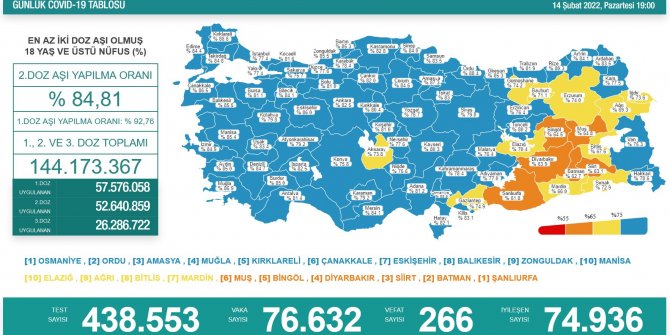 18 yaş üstü nüfusta birinci doz aşı uygulananların oranı yüzde 92,76, ikinci doz aşı uygulananların oranı yüzde 84,81 olarak kayda geçti.