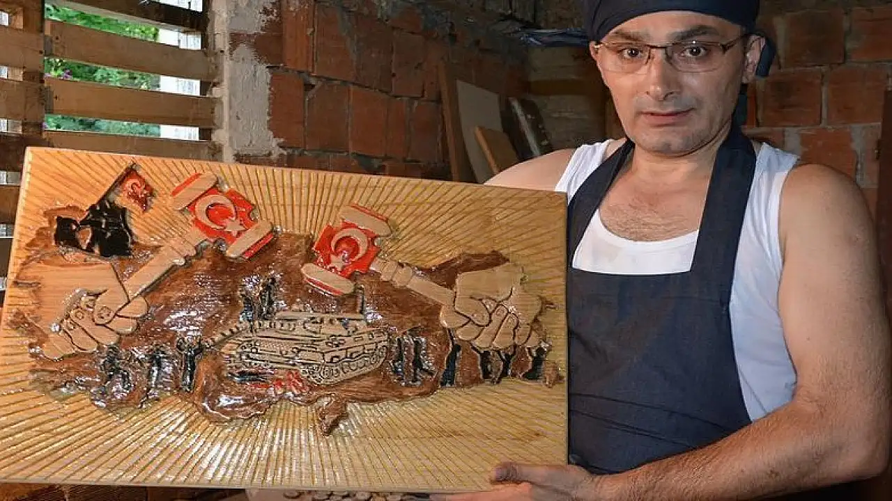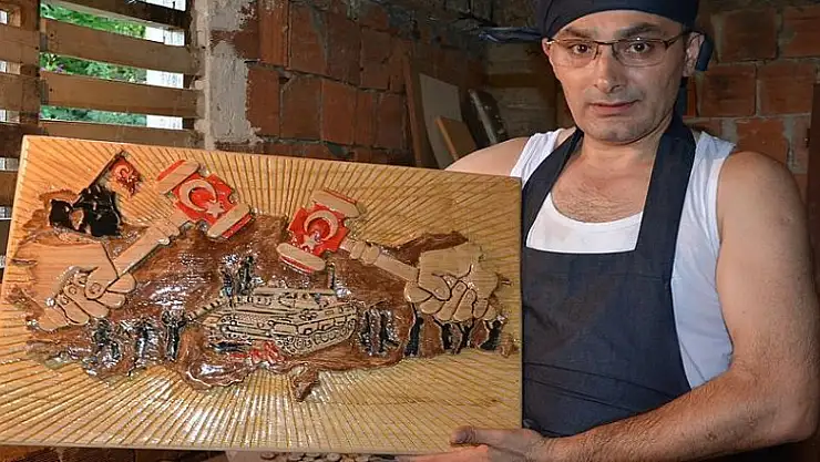 Ordu'nun Fatsa ilçesinde, ahşap oymacılığıyla uğraşan Yılmaz Demir, FETÖ'nün 15 Temmuz'da gerçekleştirdiği darbe girişiminde halkın kazandığı zaferi ahşap üzerine resim olarak kazıdı.