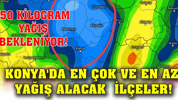 Konya'da en çok yağış alacak ilçe Derebucak iken en az yağış alacak Konya merkez, Cihanbeyli, Kadınhanı ve Altınekin olacak.