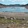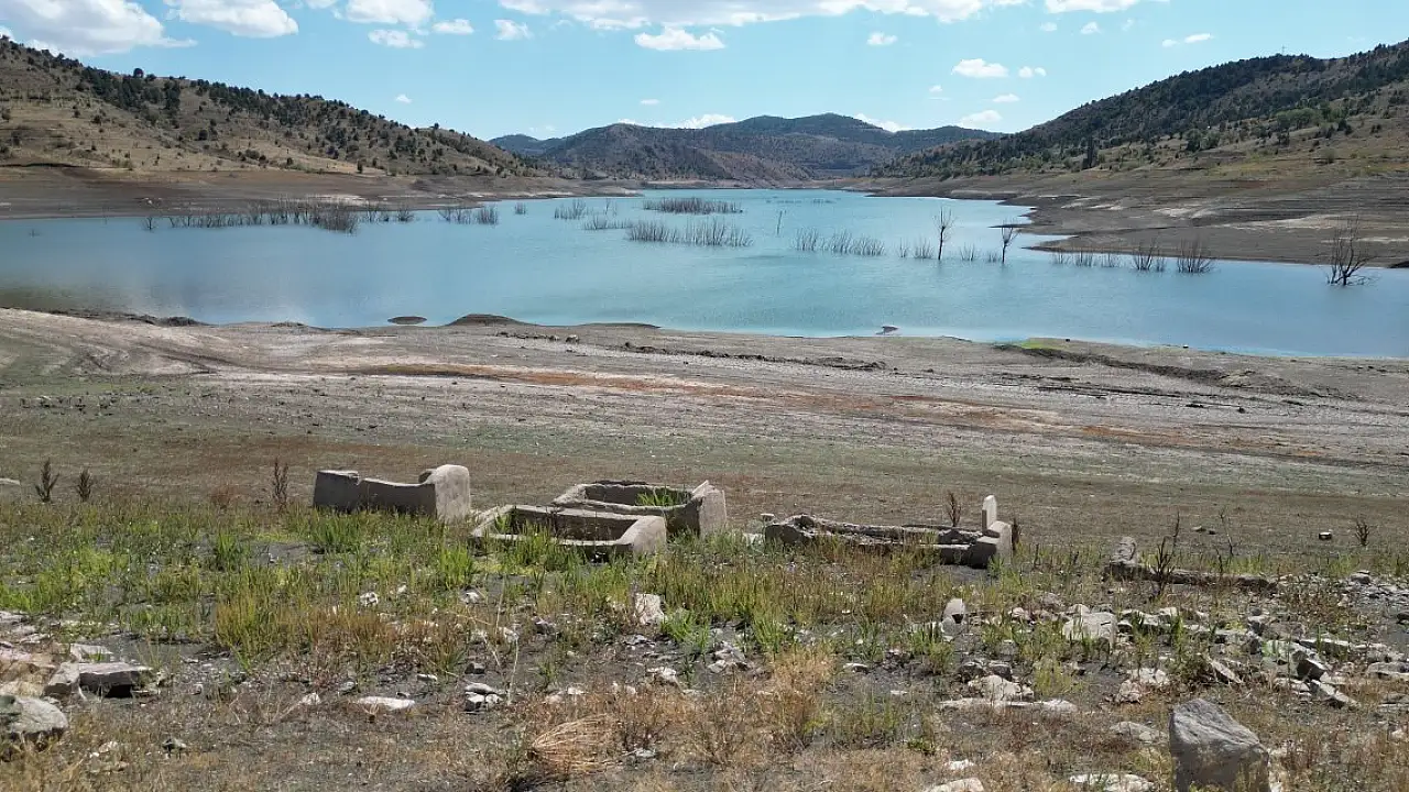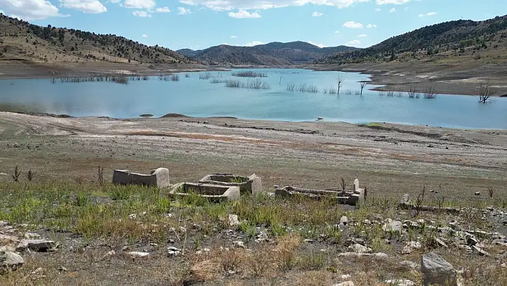 SİVAS'ın Hafik ilçesinde Pusat Barajı'nın suları kuraklık nedeniyle çekilince, Maden köyü ile mezarlığı 16 yıl sonra gün yüzüne çıktı.