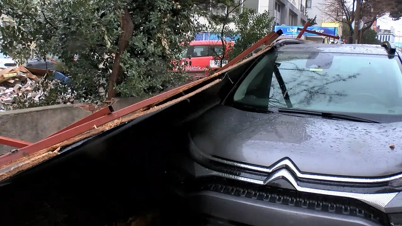 MALTEPE'de şiddetli fırtına nedeniyle 2 otomobilin üzerine inşaat panosu devrildi. Araçlarda hasar oluşurken, itfaiye ekipleri düşen panoları kaldırdı.