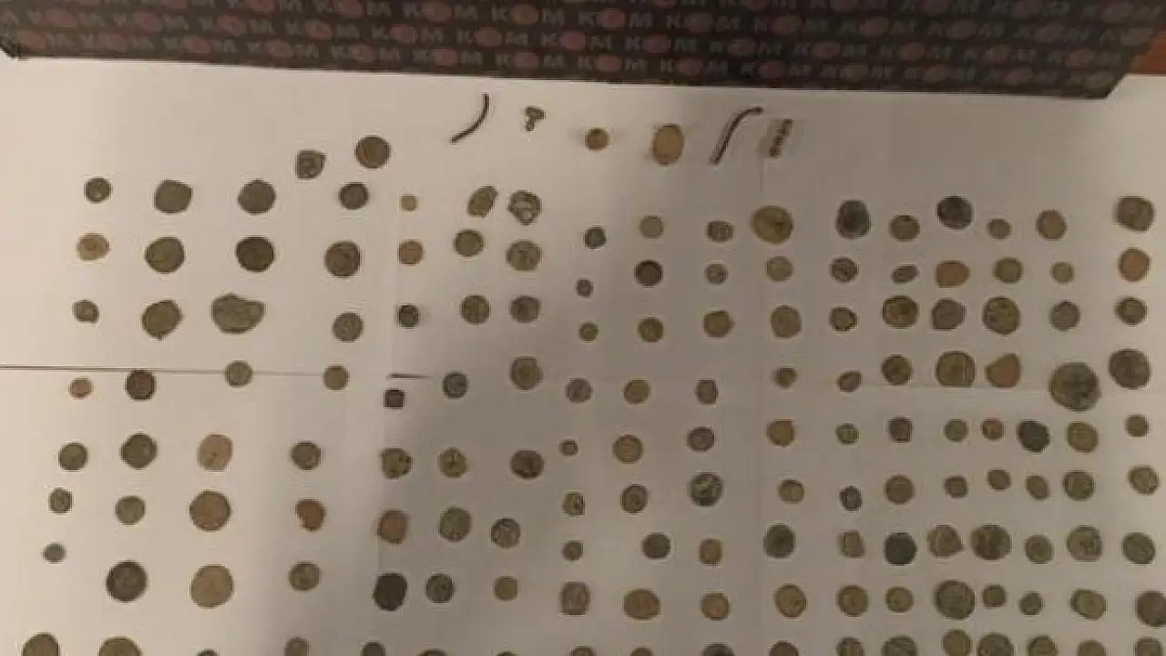 Şüphelinin üzerinde yapılan aramada, poşet içerisinde saklanan 200 sikke ve obje ele geçirildi.