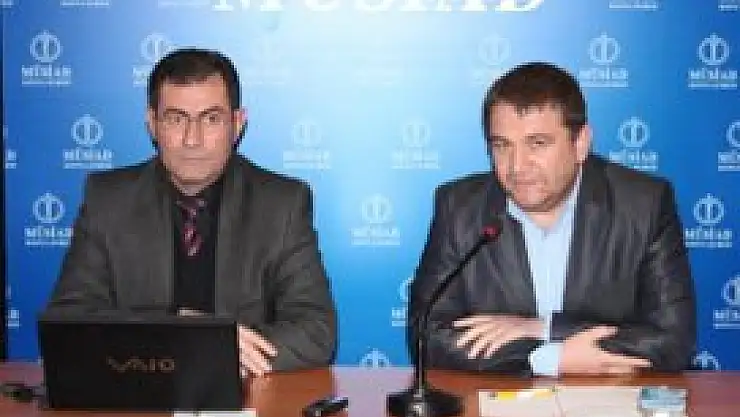 Programın sonunda MÜSİAD Konya Şubesi Cuma Toplantıları Komisyon Başkanı Lokman Koyuncuoğlu, günün anısına MEVKA Program Yönetim Birimi Uzmanı Osman Fatih Yalçın’a hediye takdim etti.