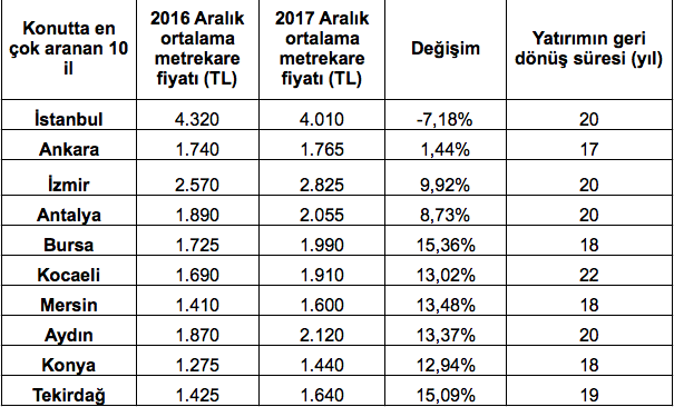 2017’de İstanbul’da konut araması en çok %84 oranı ile yine İstanbul’dan gerçekleşti. Kentsel dönüşüm etkisinin burada göze çarptığını görüyoruz. İstanbul’da konut arayanlar listesinde İstanbul’u, %3 oranında Ankara, % 2 oranında İzmir şehirleri izledi. Bu illeri takiben Bursa, Antalya ve Adana da en çok arama yapan iller arasında yer aldı.