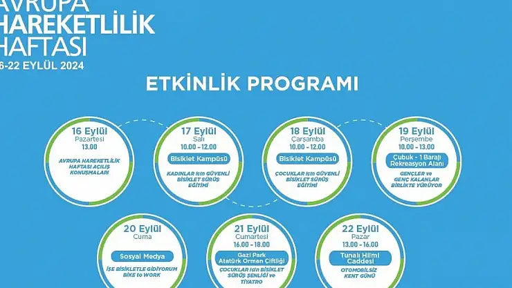 "19 Eylül 2024 Perşembe günü 10.00-13.00 saatleri arasında Çubuk-1 Rekreasyon Alanı'nda "Gençler ve Genç Kalanlar Birlikte Yürüyor" etkinliği gerçekleştirilecek. 20 Eylül 2024 Cuma günü Sosyal Medya'da "İşe Bisikletle Gidiyorum / Bike to Work" Kampanyası düzenlenecek. 21 Eylül 2024 Cumartesi günü 16.00-18.00 saatleri arasında Gazi Park Atatürk Orman Çiftliği'nde "Çocuklar İçin Bisiklet Sürüş Şenliği ve Tiyatro Gösterisi" düzenlenecek. 22 Eylül 2024 Pazar günü 10.00-18.00 saatleri arasında her yıl düzenlenen "Otomobilsiz Pazar Günü'nde bir cadde kapatılacak ve gün boyu etkinlikler düzenlenecek."