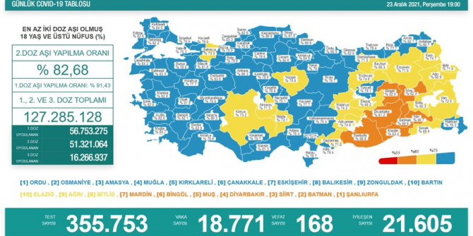18 yaş üstü nüfusta birinci doz aşı uygulananların oranı yüzde 91,43, ikinci doz aşı uygulananların oranı yüzde 82,68 olarak kayda geçti.