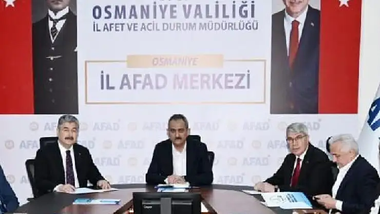 Osmaniye'de Milli Eğitim Bakanı Mahmut Özer başkanlığında AFAD Kriz Merkezinde değerlendirme toplantısı yapıldı. Toplantıya Vali Erdinç Yılmaz, Osmaniye Korkut Ata Üniversitesi Rektörü Prof. Dr. Turgay Uzun, İl Milli Eğitim Müdürü Aydın Albak ve ilgili kurum müdürleri katıldı.