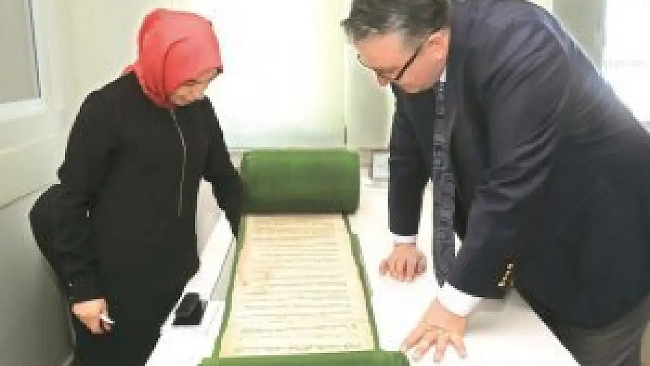 En özel ve en çok kıymet verdikleri belgenin Ayasofya Vakfiyesi olduğunu söyleyen Türkoğlu, “65 metre uzunluğunda Arapça yazılmış vakfiye, Ayasofya Vakfiyesi'nde 12 cami, aşevi, şifahane yerlerini içeriyor. Camiler içinde Ayasofya Camii, Fatih Camii, Zeyrek Camii bulunuyor. Bu camilerin tek bir vakıf tarafından yönetildiği ve gelir giderinin ne olduğunu gösteren vakfiyedir. Vakfiye, rulo halinde, ahşap gül ağacından yapılan Kubur'da saklanmış. 1950'li yıllarda İngiltere gönderiliyor. Ve maalesef ilk 3 metresini çalıyorlar" diye konuştu.