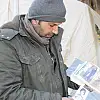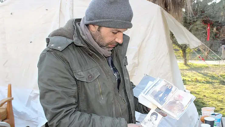 Yakınlarını kaybeden Kenan Ahmet Beyazıt, sık sık enkaz başında bulunan çadırın önünde kaybettikleri ile yıkıntı altında bulunan yakınlarının fotoğraflarına bakıyor.