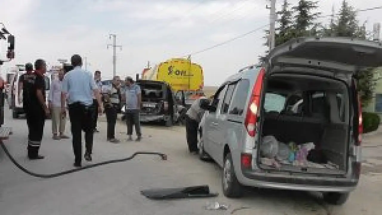 Edinilen bilgiye göre, Kulu Makas Kavşağı yakınlarında dinlenme tesislerine girmek isteyen Ali G. idaresindeki 42 M 7767 plakalı hafif ticari araç, aynı istikametten gelen Özdemir Ç. idaresindeki 57 AR 702 plakalı hafif ticari araçla çarpıştı. Çarpışmanın şiddetiyle savrulan araçlardan biri yol kenarında park halindeki Hasan A.’ya ait 42 M 5627 plakalı tankere çarparak durabildi. Diğer araçta da çarpışmanın etkisiyle yangın çıktı. Olay yerine sevk edilen itfaiye ekipleri tarafından yangına müdahale edilirken, kazada yaralanan her iki sürücü ile birlikte Musteba Y. ve Elde Ç. olay yerine sevk edilen ambulansla Kulu Devlet Hastanesi’ne kaldırılarak tedavi altına alındı.