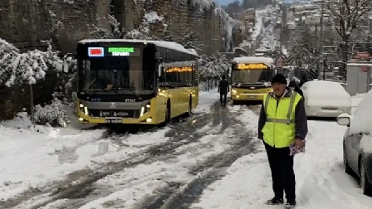 Fatih'te yoğun kar yağışı nedeniyle 3 İETT otobüsü yolda kaldı. Yolcular yollarına yaya olarak devam ederken, otobüs sürücüleri araçlarını kurtarmaya çalıştı.