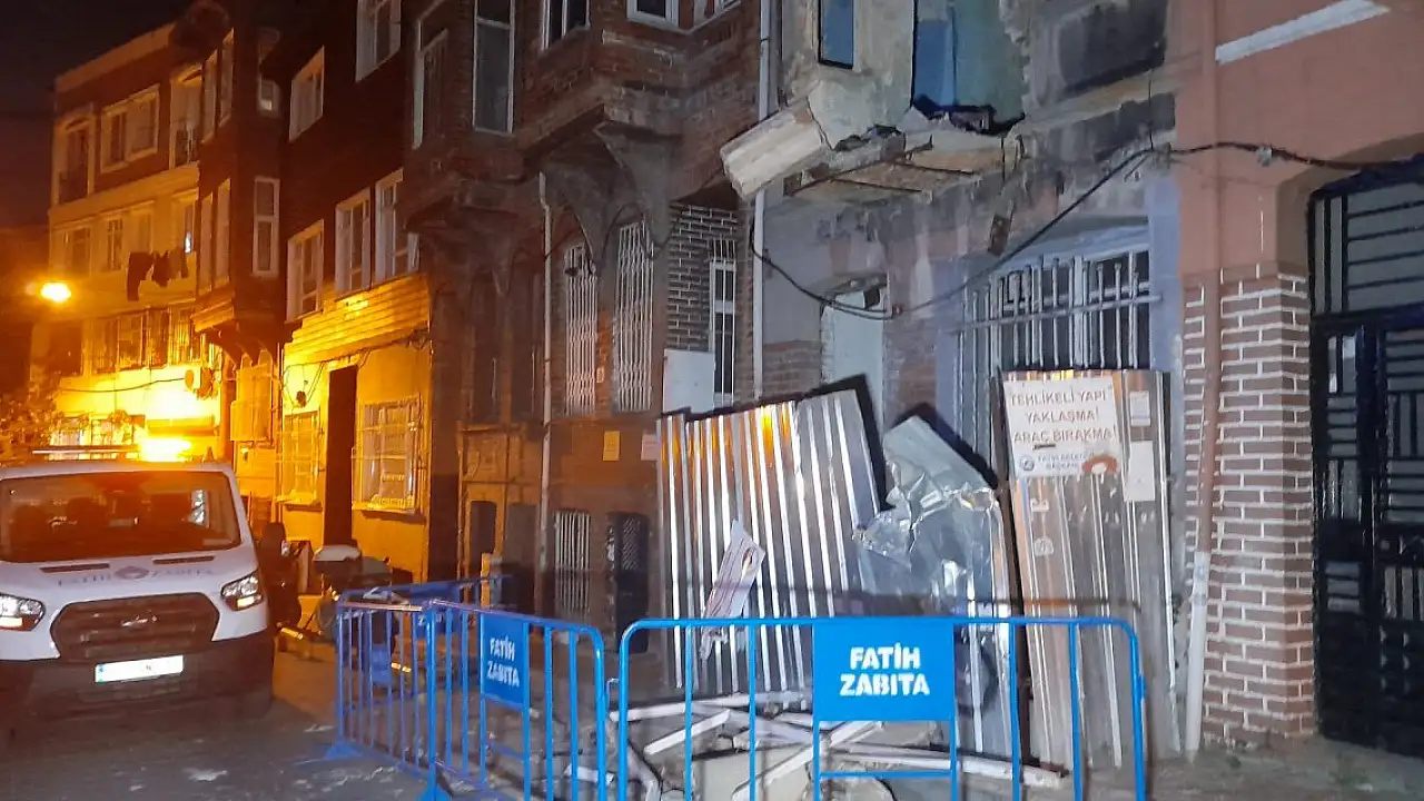 FATİH'te daha önce boşaltılan ve etrafında güvenlik önlemi alınan 3 katlı metruk binanın balkonu çöktü.