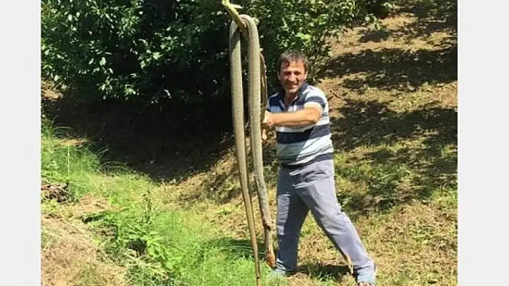 Sakarya'nın Akyazı ilçesinde bahçede çalışan mevsimlik işçiler, karşılarına çıkan yaklaşık 3 metre uzunluğundaki yılanı öldürüp sosyal medyadan paylaştılar.