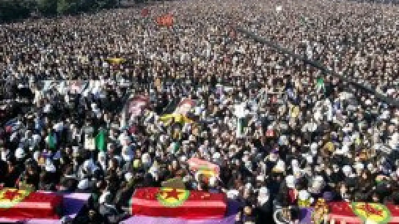 Sözde PKK bayraklarına sarılı tabutlar kadın ların omuzunda hazırlanan platformlara konuldu. Kadınlar, tabutların etrafında çember oluşturdu. Yüzbinlerce kişi hep bir ağızdan "Şehîd namirin" ve "Güneşin yoldaşları ölümsüzdür" sloganları attı.