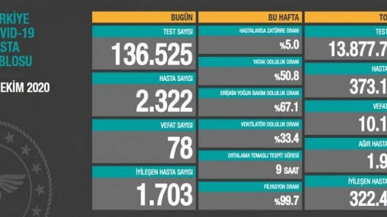 Sağlık Bakanı Fahrettin Koca, 30 Ekim koronavirüs tablosuna ilişkin yaptığı açıklamada, ''Bugün tespit edilen 2.322 yeni hastamız var. Ağır hasta sayımız 2.000’e yaklaştı. Salgınla mücadele hem bireysel hem de toplu halde tedbirlere uymaktan geçiyor. Yarın bugünden daha az hastamız olsun istiyorsak hareketliliği üçte birine indirmeliyiz.'' ifadesini kullandı.