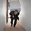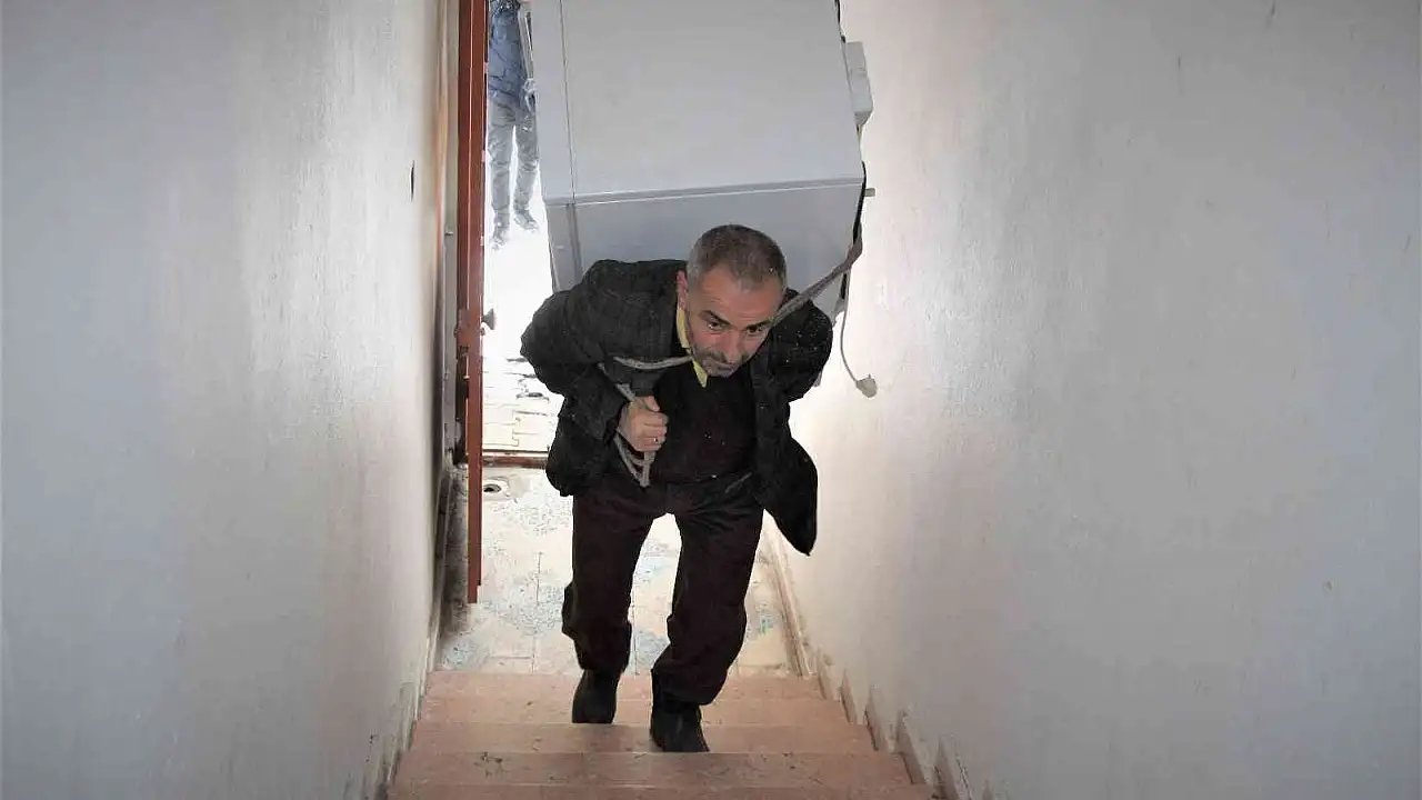 30 yıldır bir şehrin yükünü taşıdığını belirten Balkoç, "30 senedir bu işi yapıyorum. Kendi bileğim ve kendi yüreğimle yapıyorum. Halkımız da beni çok seviyor. Bu tablo ile kendi yüreği ve bileğiyle çalışan bir adamım. Çok şükür kimse bende de şikayetçi değil. İşim çok zordur. 5'inci kata kadar buzdolabı, çamaşır makinesi, kanepe çıkarıyorum. Çoluk çocuğun rızkını bu işle çıkarıyorum. Sabah 06.00'da kalkıyorum, 19.00'a kadar çalışıyorum. Ondan sonra eve gidiyorum her tarafım ağrıyor. Kaslarım, belim ağrıyor, sırtım ağrıyor. Ne yapalım, ekmek zordur. 8 nüfusa bakmak öyle kolay değil. Bu zahmetle rızkımı çıkarıyorum" şeklinde konuştu.