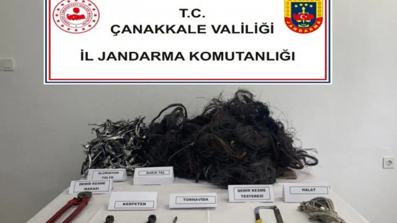 Çanakkale Cumhuriyet Başsavcılığı tarafından başlatılan soruşturma kapsamında İl Jandarma Komutanlığı ekipleri, Çanakkale Merkez, Bayramiç ve Lapseki ilçelerinde haberleşme ve enerji nakil kablosu hırsızlığı suçu kapsamında, kamuyu zarara uğratarak vatandaşların haberleşme özgürlüğünü kısıtlayan şüphelileri takibe aldı. Önceki gün düzenlenen eş zamanlı operasyonlarda; 7 şüpheli yakalanarak gözaltına alındı. Son iki aydaki faili meçhul haberleşme ve enerji nakil kablosu hırsızlığı olayları aydınlatılırken, değeri yaklaşık 350 bin TL olan enerji nakil kablosu ve hat yapımında kullanılan malzeme ele geçirildi.