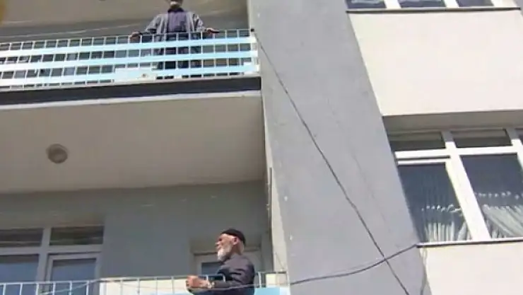 Kardeş dedelerin balkon sohbeti saatlerce sürdü. Böylece hem sosyalleştiler hem de virüs kapma riskini en aza indirdiler. Dedeler herkese "evde kalın" mesajı verdi.