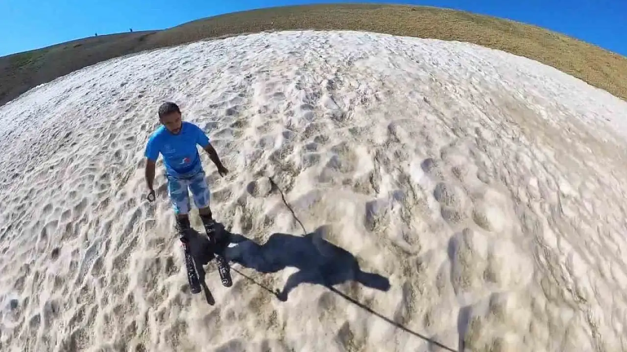 Erzincan'da doğa tutkunu kayak hocası Canser Atila ağustos ayında çıktığı 3 bin 250 rakımda kayak yaparak serinlerdi.