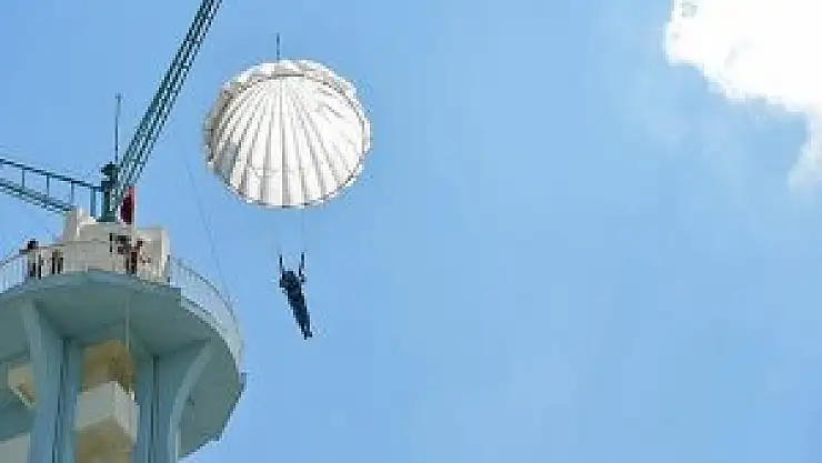 Atlayıştan önce kişiye kısaca kuralları anlattıklarını belirten Kaynak, "Paraşütte çift ağırlık sitemli bir mekanizma kullanıyoruz. Paraşüt, kuleye bağlı ve zaten açık oluyor. 38 metreden ilk atlayışta kişi, 3 metre kadar düşüyor ve bu da yaklaşık 1 saniye sürüyor. Bu düşüşten sonra kişi paraşüte asılı olarak inmeye başlıyor" dedi.