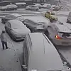 Kağıthane'de karlı yolda aracıyla yokuştan inen bir sürücü kaymaya başladı. Sürücünün direksiyon hakimiyetini kaybettiği araç, çarptığı motokuryeyi sürükledikten sonra 5 araca daha çarparak durabildi.
