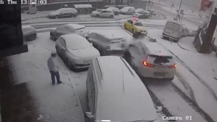 Olay, 1 Ocak Perşembe günü saat 13.45 sıralarında Talatpaşa Mahallesi'nde meydana geldi. Edinilen bilgiye göre kar yağışı sonrası sürücü Eren Seza T., 34 KTZ 342 plakalı aracıyla yokuştan inmek istedi. Ancak kaymaya başlayan araç, önce yolun başında duran 34 HYU 038 plakalı motokurye Emre Onur A.'ya çarptı. Ardından da park halindeki 34 HSB 939 ve 34 KTZ 342 plakalı araçlara çarpmasının ardından, Hakkı K.'nin kullandığı 34 TDN 41 plakalı taksiye ve park halindeki 34 LEV 345 plakalı araçlara çarparak durabildi. Olay anı güvenlik kamerasına yansıdı.