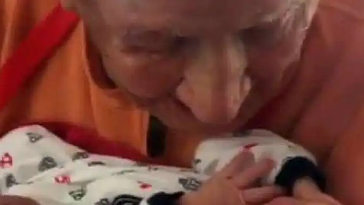 5 günlük torununu kucağına alan 105 yaşındaki Kanadalı dedenin mutluluğu yüzüne ve kelimelerine yansıdı.