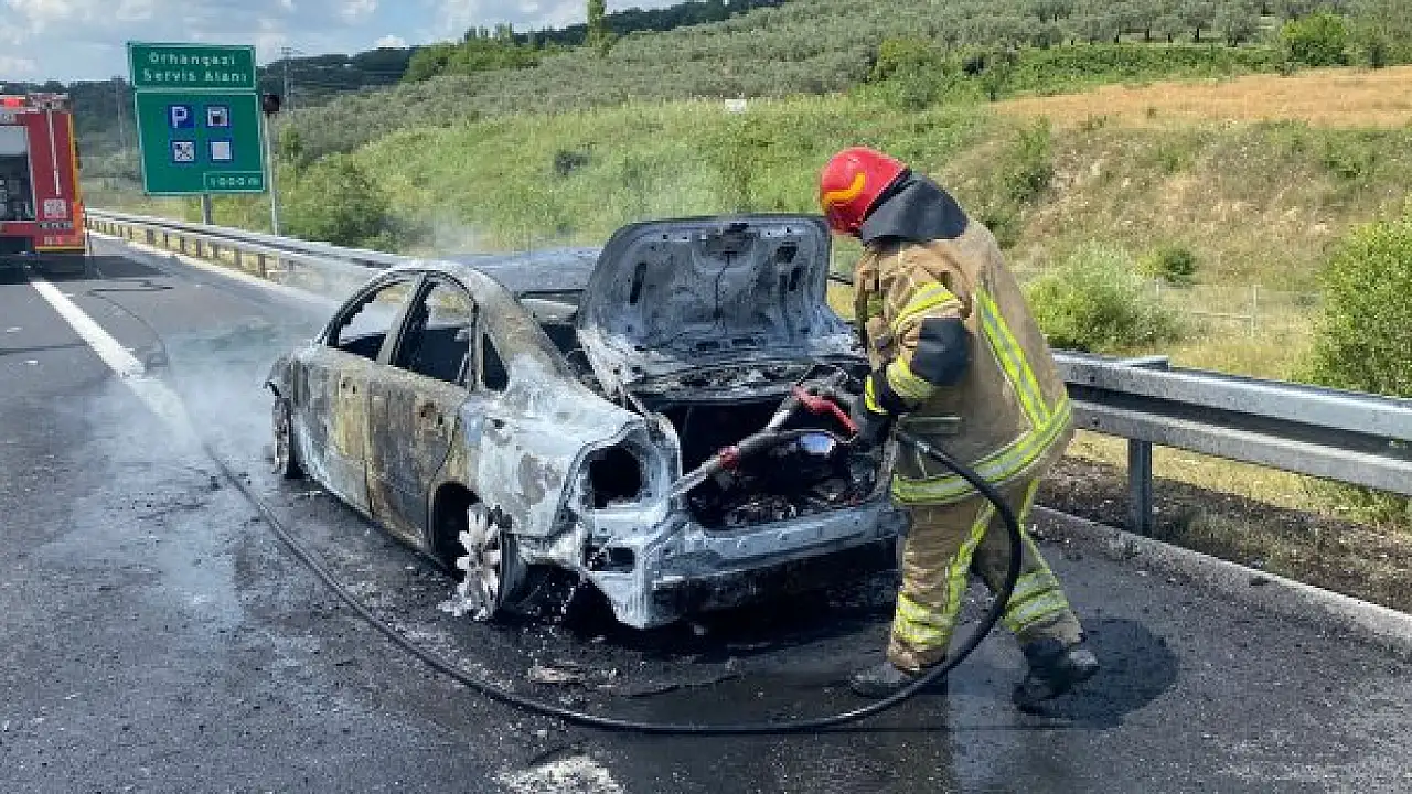 BURSA'nın Orhangazi ilçesinde otomobilin motor kısmından çıkan dumanları fark eden sürücü, aracı emniyet şeridine çekip, eşi ve 3 çocuğunu indirdi. Alev topuna dönen otomobildeki yangına diğer sürücüler ile itfaiye ekipleri müdahale etti ancak araç demir yığınına döndü.