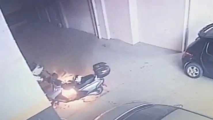 Bursa'da park halinde bir binanın altında bulunan 5 motosiklet alevlere teslim oldu. Motosikletler kullanılmaz hale gelirken, o anlar güvenlik kamerasına yansıdı.