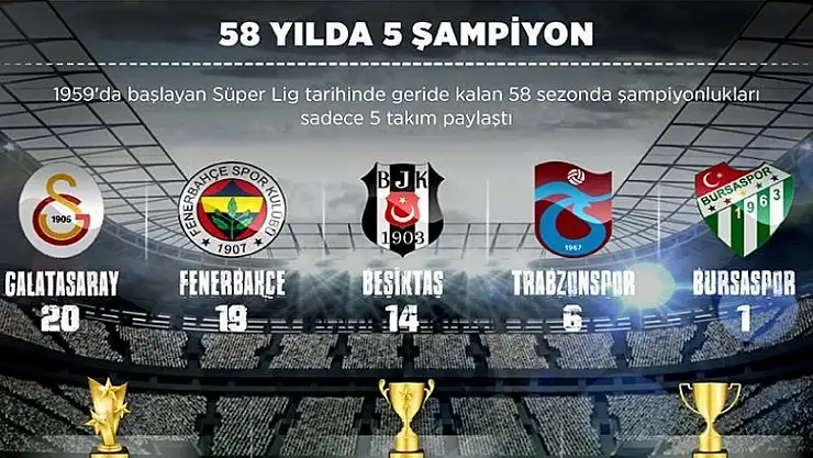 1959'da başlayan ligde şimdiye dek Galatasaray, Fenerbahçe, Beşiktaş, Trabzonspor ve Bursaspor dışında, 58 sezonda şampiyonluk sevincini yaşayan takım çıkmadı.