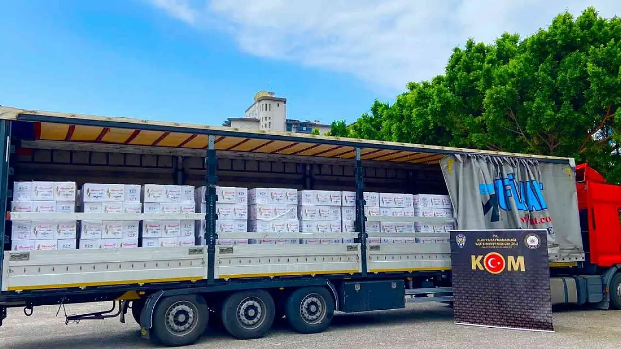 Antalya'nın Alanya ilçesinde Kaçakçılık ve Organize Suçlarla Mücadele (KOM) Büro Amirliği ekipleri, kente yüklü miktarda kaçak alkol geleceği bilgisi üzerine harekete geçti. Takibe alınan tır Konaklı Mahallesinde polis ekipleri tarafından durduruldu. Yapılan aramalarda tırın dorsesinde piyasa değeri 6 milyon TL olan 17 bin 160 şişe kaçak alkol ve 19 bin 500 adet sahte bandrol ele geçirildi. Gözaltına alınan M.A., işlemlerinin ardından serbest bırakıldı.
