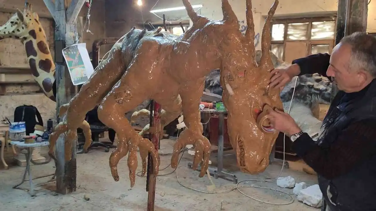 Bursa'da kalıp ustası hurda gazeteden 3,5 metre uzunluğunda ejderha maketi yaptı gören gerçek sanıyor.