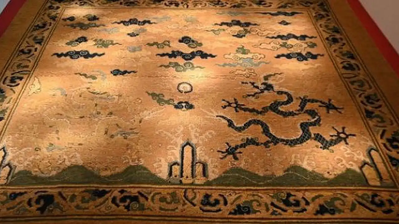 Halının üzerinde, beş pençeli ejderha ve üzerlerinde bulutların olduğu görülüyor. Ejderhaların imparatorluğun gücünü simgelediği belirtiliyor.