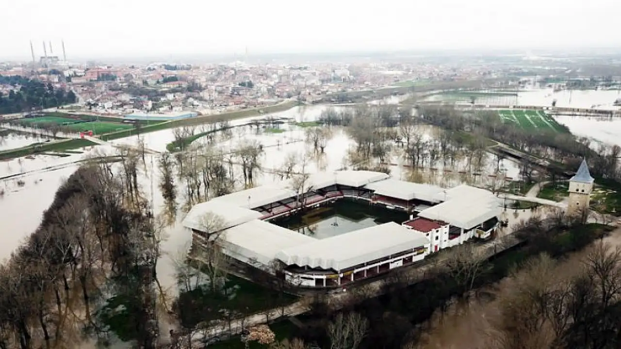 Edirne’de etkili olan yağmur ve kar sularının erimesiyle birlikte Tunca Nehri'nin debisi hızla yükseldi. Tunca Nehri'nde ‘turuncu’ olan alarm durumu ‘kırmızı’ya geçti. Nehrin taşması sonucu Tarihi Kırkpınar Yağlı Güreşleri’nin yapıldığı Er Meydanı tamamen sular altında kaldı.