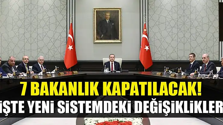 Bakanlıkların yapısının değiştirilmesine ilişkin çalışmalarda sona yaklaşılıyor. 21 mevcut bakanlıktan Avrupa Birliği (AB) Bakanlığı, Ekonomi Bakanlığı, Gençlik ve Spor Bakanlığı, Gümrük ve Ticaret Bakanlığı, Kalkınma Bakanlığı, Kültür ve Turizm Bakanlığı, Orman ve Su İşleri Bakanlığı kapatılacak. Ekonomi başta olmak üzere birçok bakanlığın yetki ve sorumlulukları artacak.