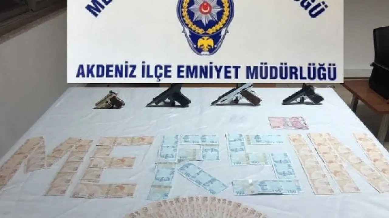 İl Emniyet Müdürlüğünden yapılan açıklamaya göre, Akdeniz ilçe Emniyet Müdürlüğü ekipleri Mesudiye Mahallesi'nde bulunan bir iş yerine operasyon düzenledi. Operasyonda daha önceden birçok suç kaydı bulunan S.A., G.D. ve M.E. isimli şahıslar gözaltına alınırken, iş yerinde yapılan aramalarda farklı marka ve kalibrelerde 4 ayrı ruhsatsız tabanca ile 2 adet 200, 23 adet 100 ve 86 adet 50'lik banknotlar halinde toplamda 7 bin lira sahte para ele geçirildi.