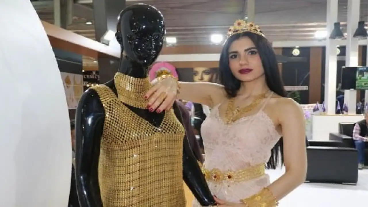 Diyarbakır'da başlayan 2. Mezopotamya Mücevher Fuarı'nda sergilenen altından elbise ziyaretçilerin ilgi odağı oldu. 7 kilogram ağırlığında olan 1 milyon 100 bin lira değer biçilen altından elbise alıcısını bekliyor