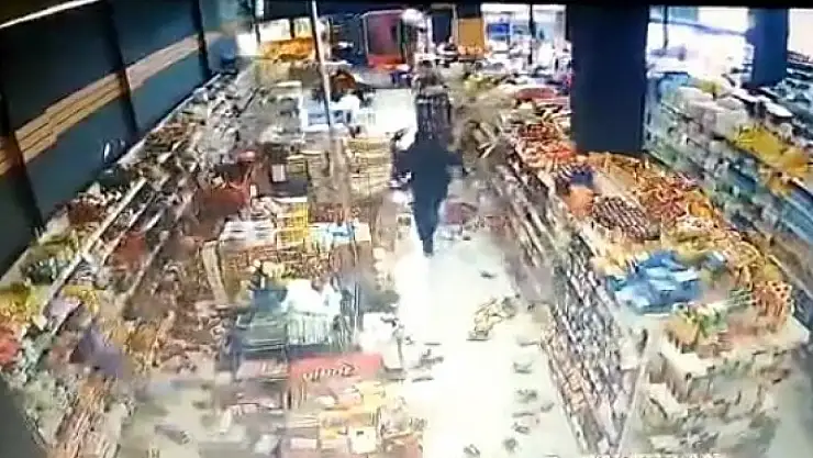 Malatya'da Kahramanmaraş merkezli 7,6 büyüklüğündeki depreme ait yeni görüntüler ortaya çıktı. O anlarda bir markette yaşanan korku ve panik anbean kameralara yansıdı.