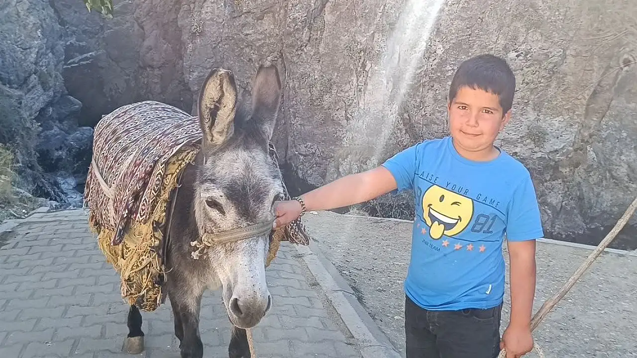 Kayseri'nin Develi ilçesinde 9 yaşındaki Musa; Homurlu Şelalesi'ne gelen misafirleri eşekle gezdirerek okul harçlığını çıkartıyor.