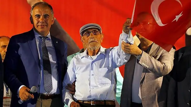 İzmir'de 95 yaşındaki Hacı Keskinbalta, ilerleyen yaşına rağmen Konak Meydanı'nda FETÖ'nün darbe girişimine karşı ilk günden itibaren 'demokrasi nöbeti' tutarak Türk Bayrağıyla çalan marşlara eşlik ediyor.