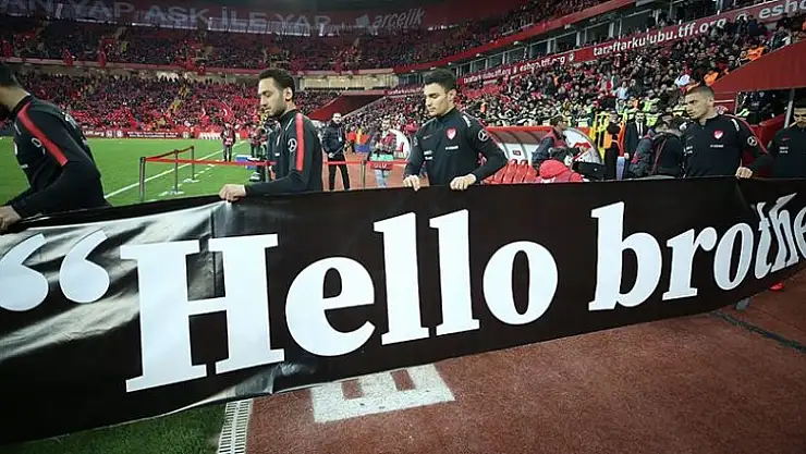 A Milli Futbol Takımı ısınmaya 'Hello brother' yazılı pankartla çıktı