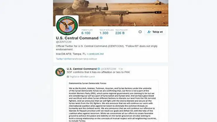 Söz konusu paylaşımında SDG'nin açıklamasının ekran görüntüsünü kullanan CENTCOM, açıklamanın üstüne de "SDG, PKK ile herhangi bir bağının veya ilişkisinin olmadığını onaylıyor" ifadelerine yer vererek PYD'nin "sözcülüğünü" yaptı.