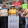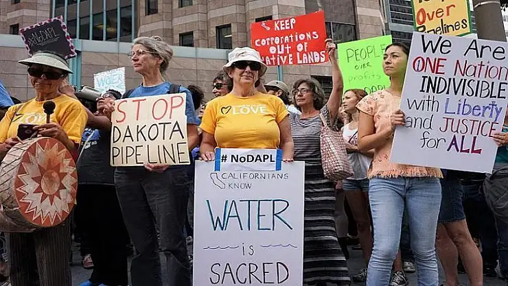 Yerlilerin dans edip şarkı söylediği, tütsüler yaktığı protestoda eylemciler, “Boru hattını durdurun”, “Su hayattır" yazılı dövizler taşıdı.
