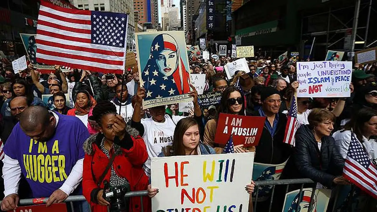 Trump'ın bazı İslam ülkelerine getirdiği vize kısıtlamaları, Müslüman, Hristiyan ve Musevilerin yanı sıra diğer din ve inanışlara mensup Amerikan vatandaşları tarafından Times Meydanı'nda düzenlenen mitingle protesto edildi.