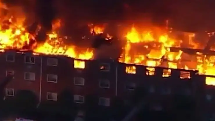 Üç katlı apartman kompleksi, bitişik evlerden oluşuyordu ve başlayan yangın rüzgarın da etsiyle kısa sürede yayıldı.